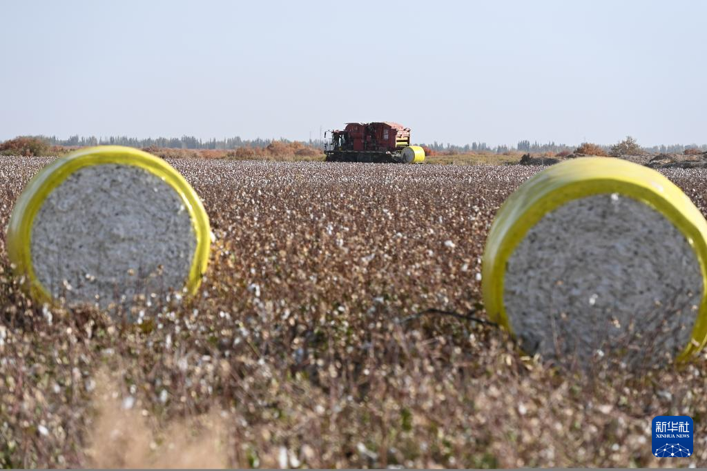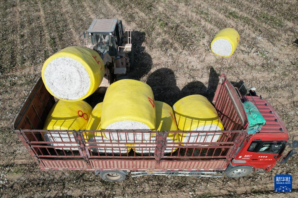 截至目前,张生共流转了周边乡镇1.2万亩土地种植棉花。这几天,他忙着棉花采收和转运。采棉机将采摘下的棉花压缩打包,这些棉包随后会被运至加工厂。