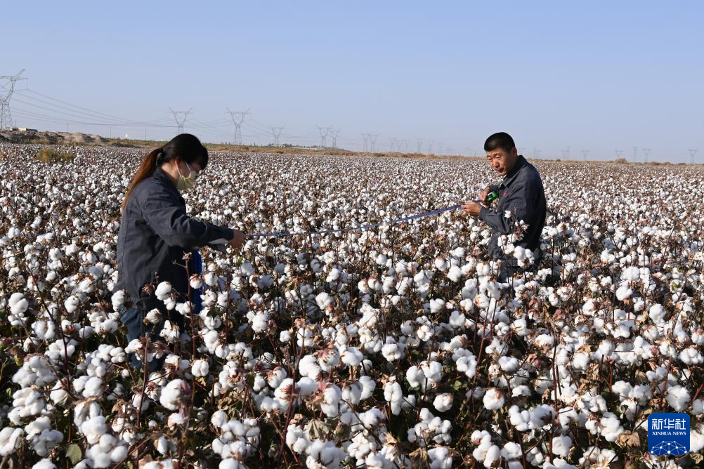10月15日,敦煌市农业技术推广中心工作人员在棉田中测产。新华社记者 范培珅 摄