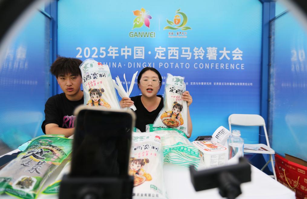 工作人员在2025年中国·定西马铃薯大会的产品展示区直播带货。新华社发(王克贤 摄)